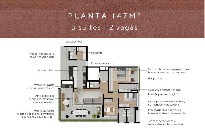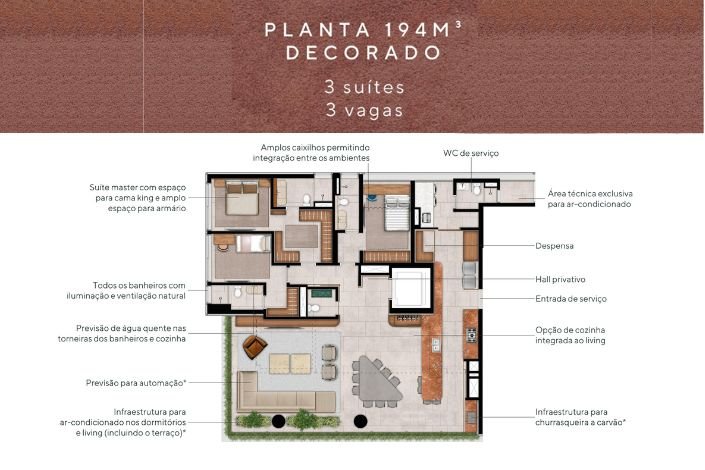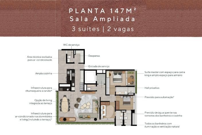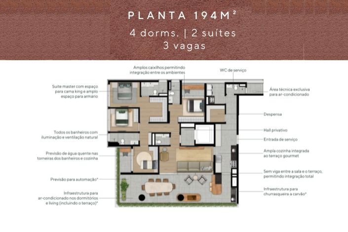 • Apartamentos de 147 e 194m², 2 e 3 suítes, 2 ou 3 vagas e todos com terraço integrado.